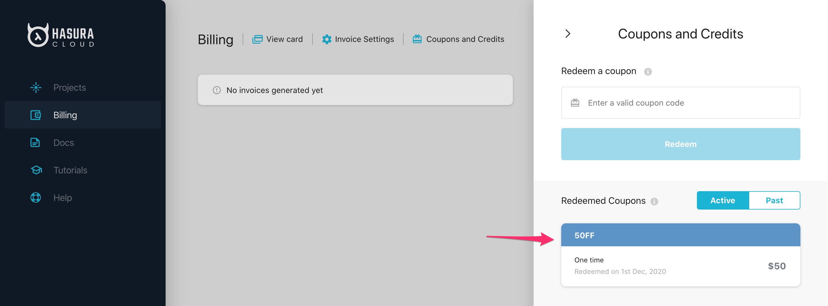 If you have a coupon, you can redeem it from the dashboard to get a credit waiver on your next invoice. Discounts will be adjusted while creating the invoice.