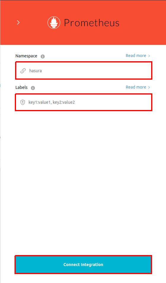Enter the Namespace and label values to be associated to the exported metrics and click on Connect Integration.