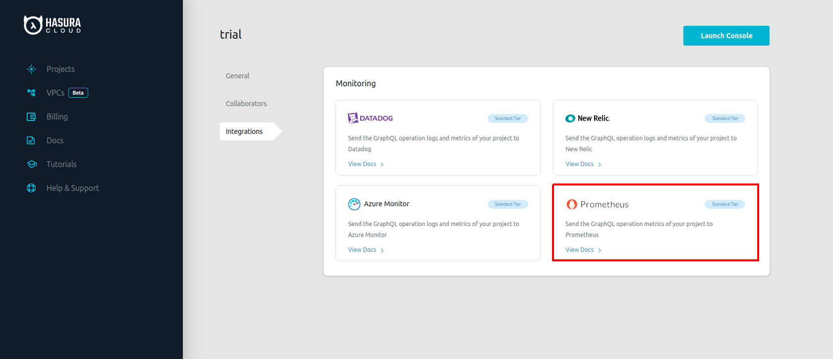 You can export metrics of your Hasura Cloud project to Prometheus. This can be configured on the integrations tab on the project’s setting page.