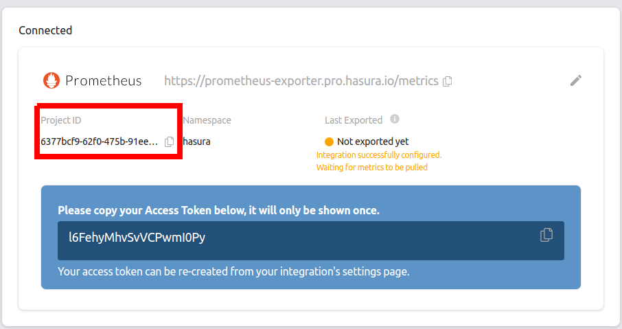 The Access Token is generated once the Integration is created. The token is showed only once and cannot be retrieved again. Access token is used as the password for Basic Authentication by the Prometheus Agent.