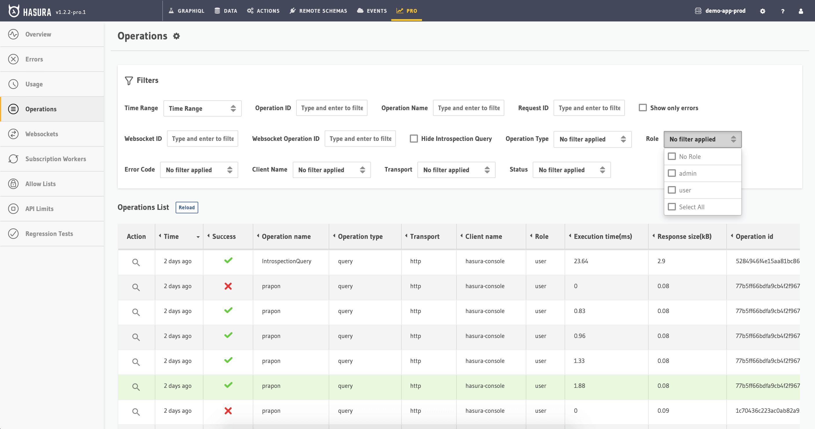 Processed realtime logs of all requests to the GraphQL Engine. View all and inspect individual operations:
