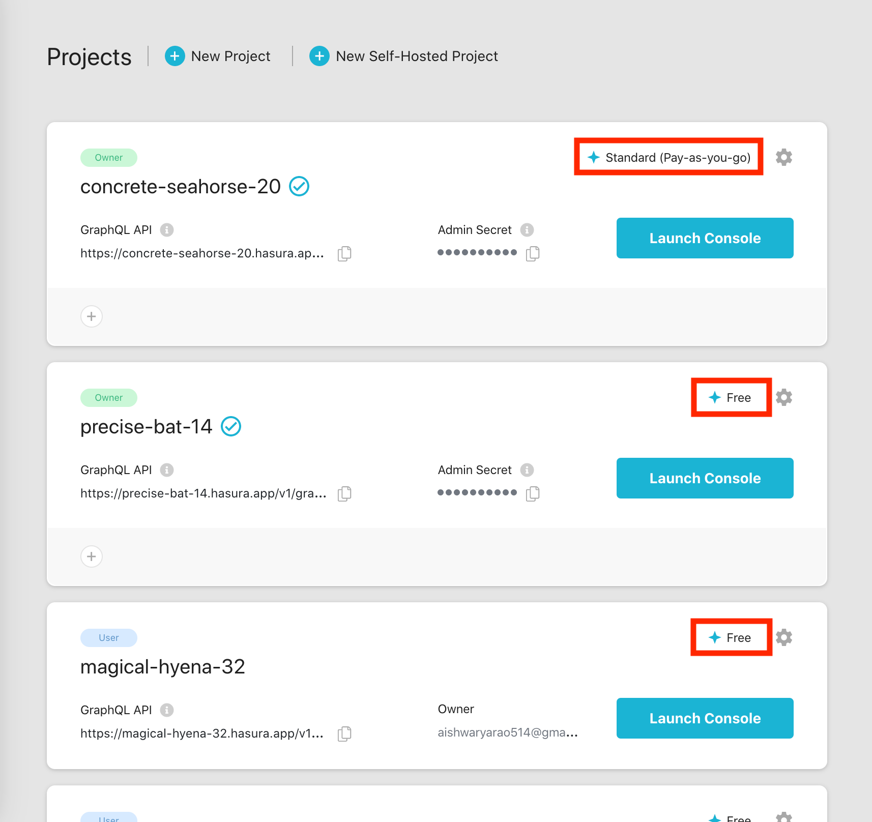 By clicking on the Projects tab, you can see all your projects and what plan they are currently on:
