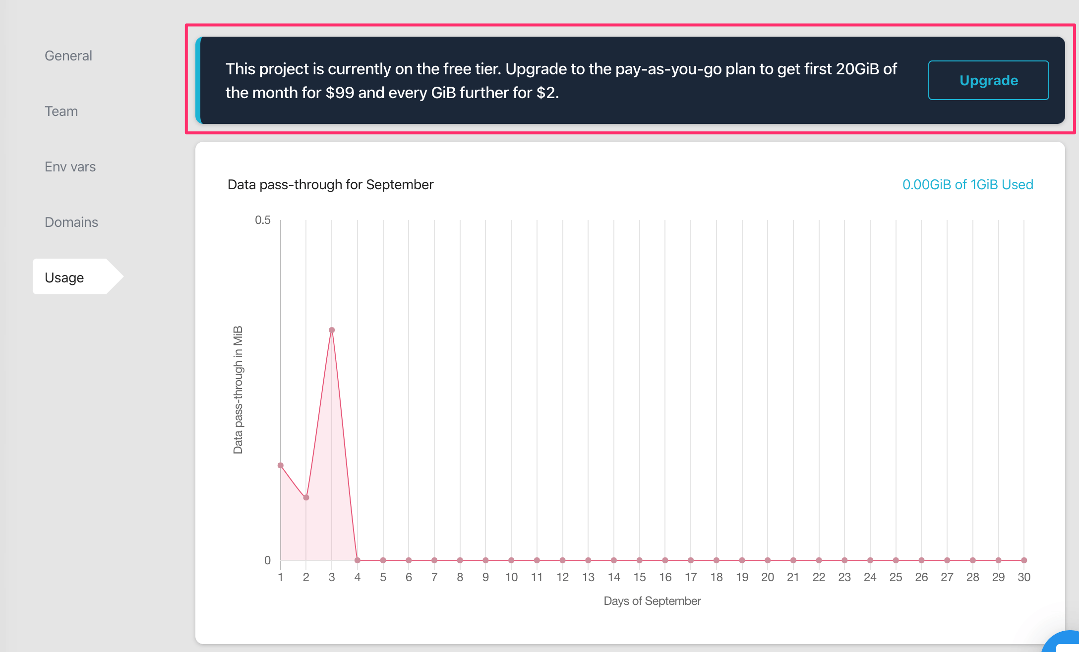 Now click on the Usage tab. To upgrade to the Standard plan, click on the Upgrade button: