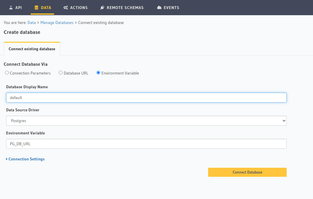 HASURA_GRAPHQL_DATABASE_URLenv var as well in which case it gets added automatically as a database nameddefault