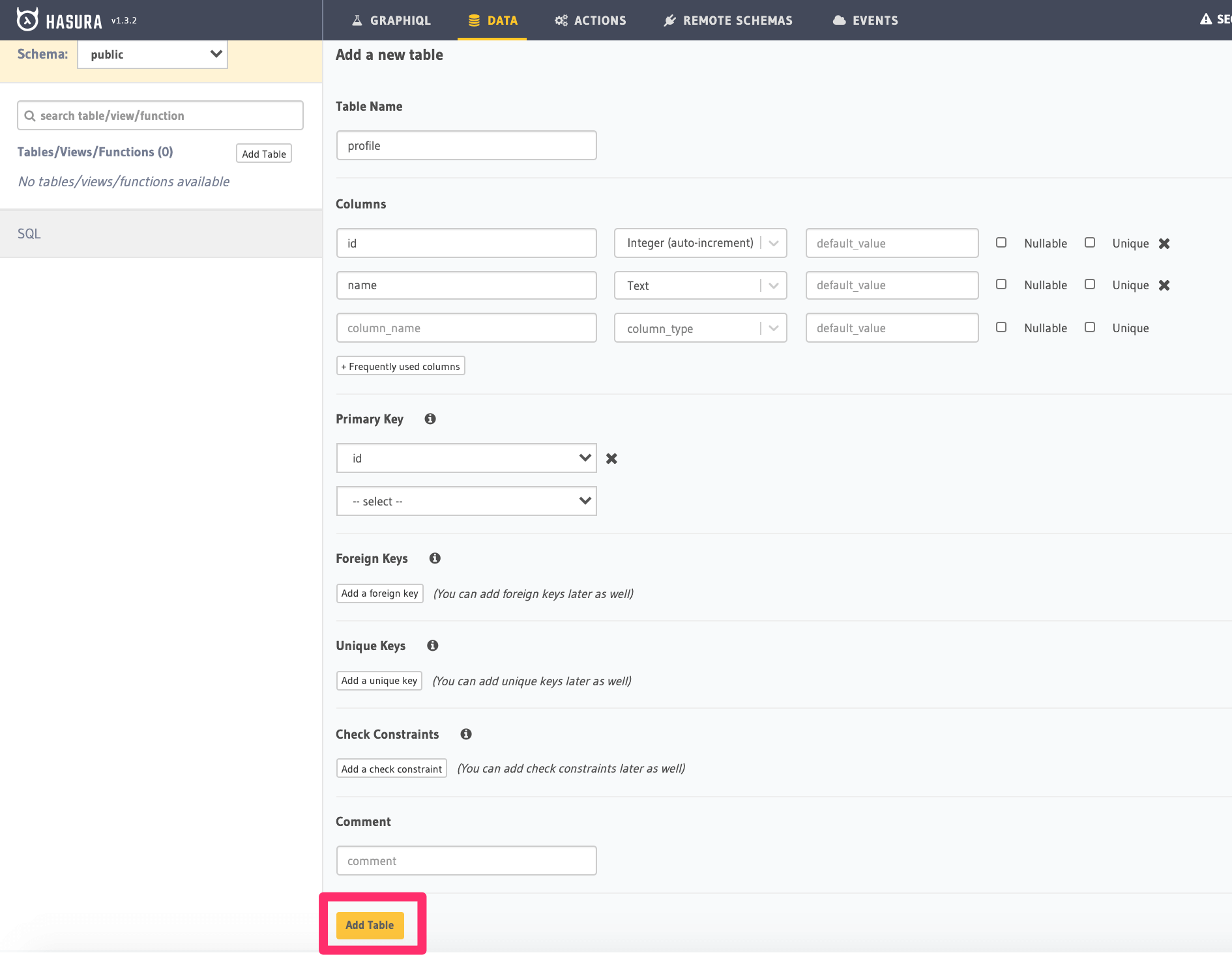 Navigate to Data -> Add table on the console and create a table called profile with the following columns: