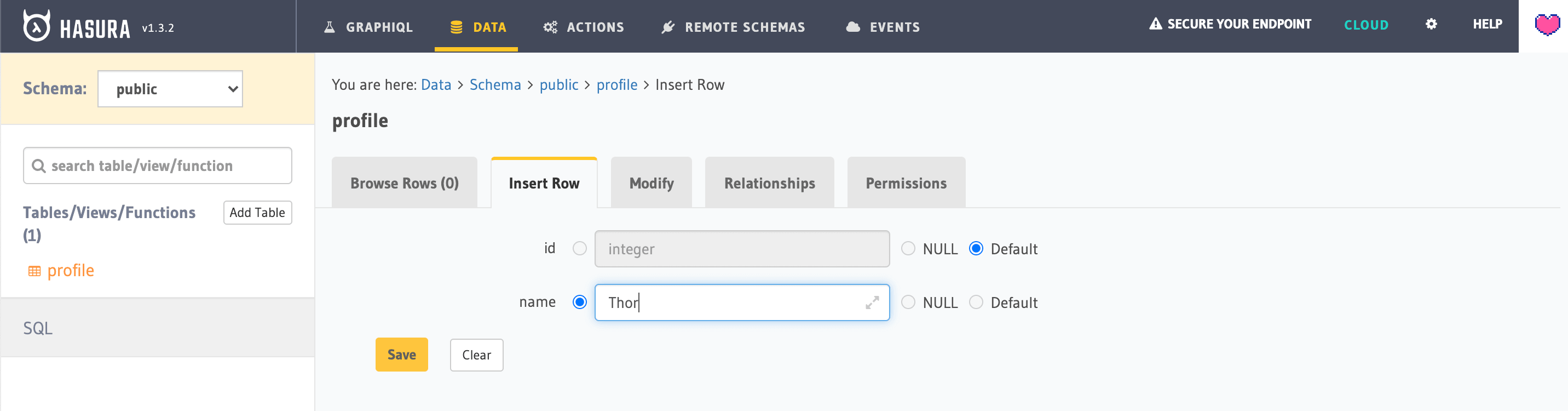 Once the table is created, go to the Insert Row tab and insert some sample rows: