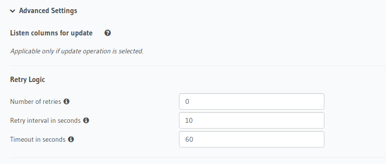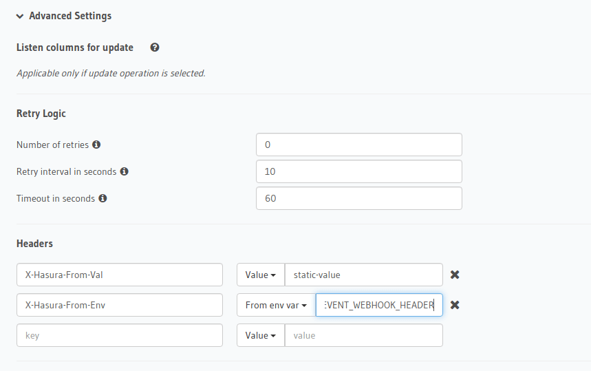 Expand the Advanced Settings section on the Hasura console to define advanced settings for an event trigger: