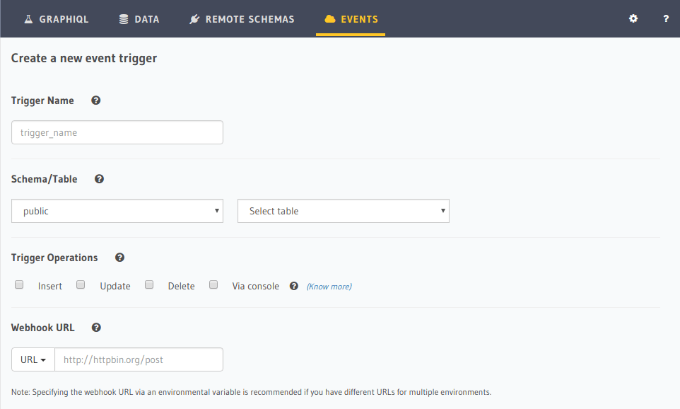 Open the Hasura console, head to the Events tab and click on the Create button to open the page below:
