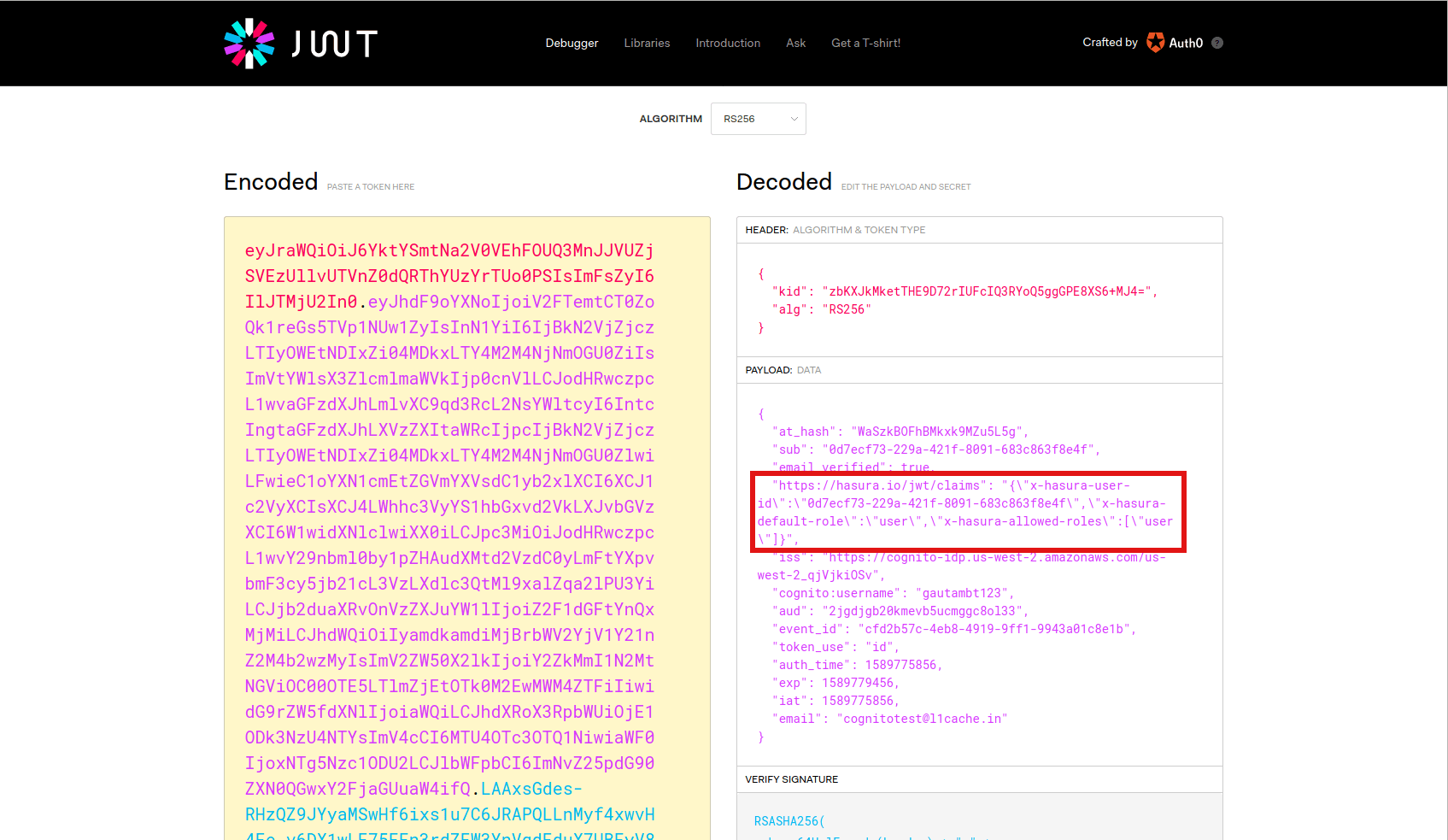 - To test this JWT, and to see if all the Hasura claims are added as per the sections above, let’s test this out with jwt.io!