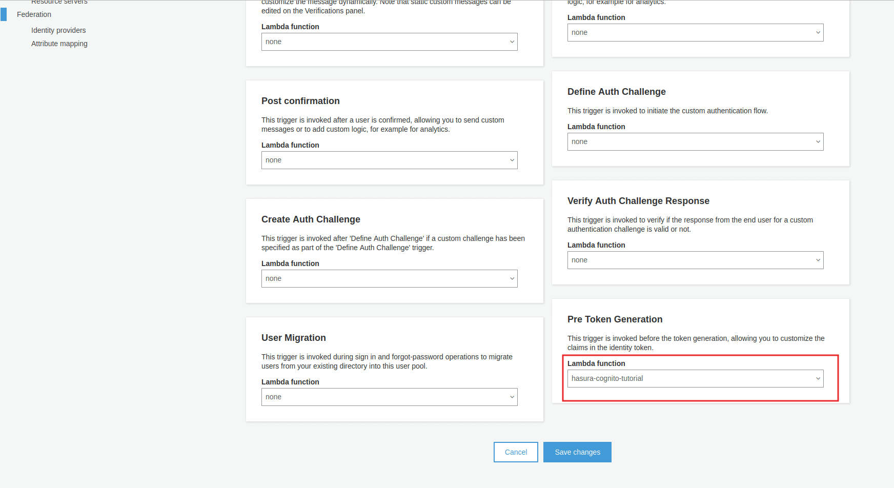 In cognito, select Triggers -> Pre Token Generation and choose the lambda function created above: